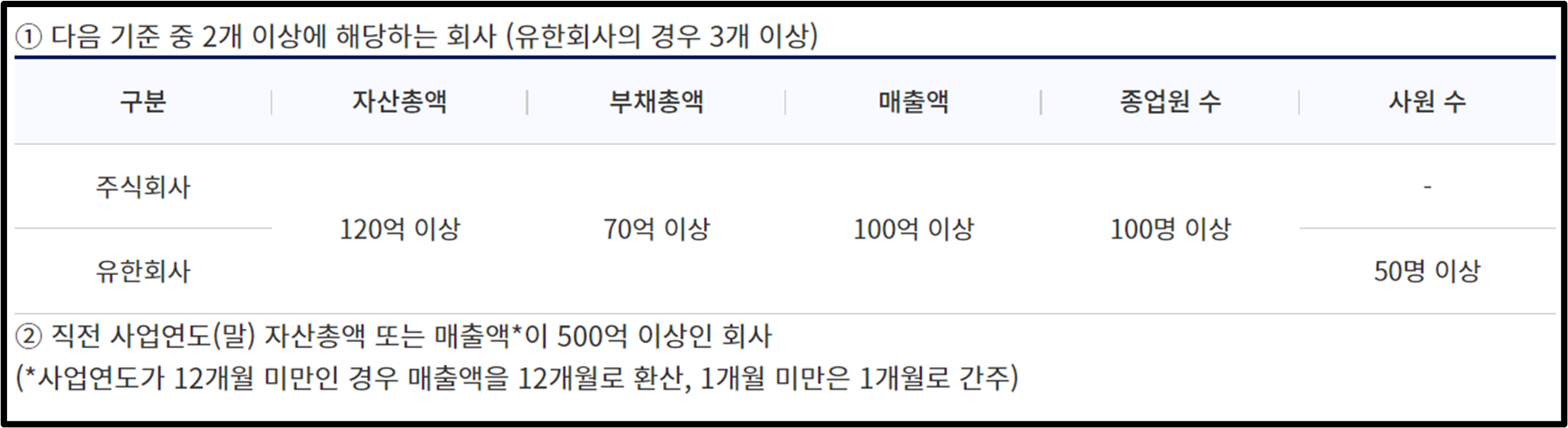 [①자산총액 120억 이상 ②부채총액 70억 이상 ③매출액 100억 이상 ④종업원 100명 이상]