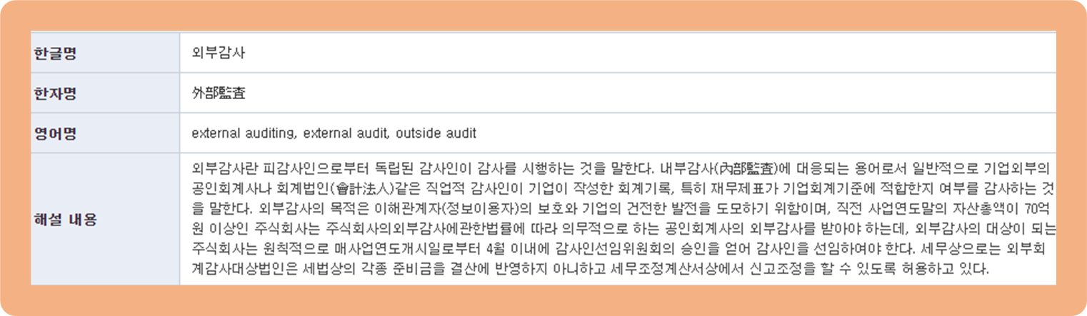 외부감사란, 해당 기업과 이해관계가 전혀 없는 외부 감사인이 해당 기업에 대해 회계 감사를 행하는 제도에요..