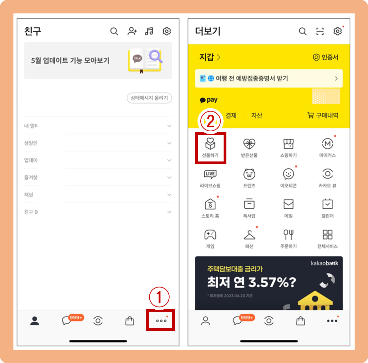 다시 카톡 어플을 실행해주시고 [왼쪽사진] '점 3개 모양 버튼' 클릭 후 [오른쪽 사진] '선물하기' 버튼을 눌러주세요.