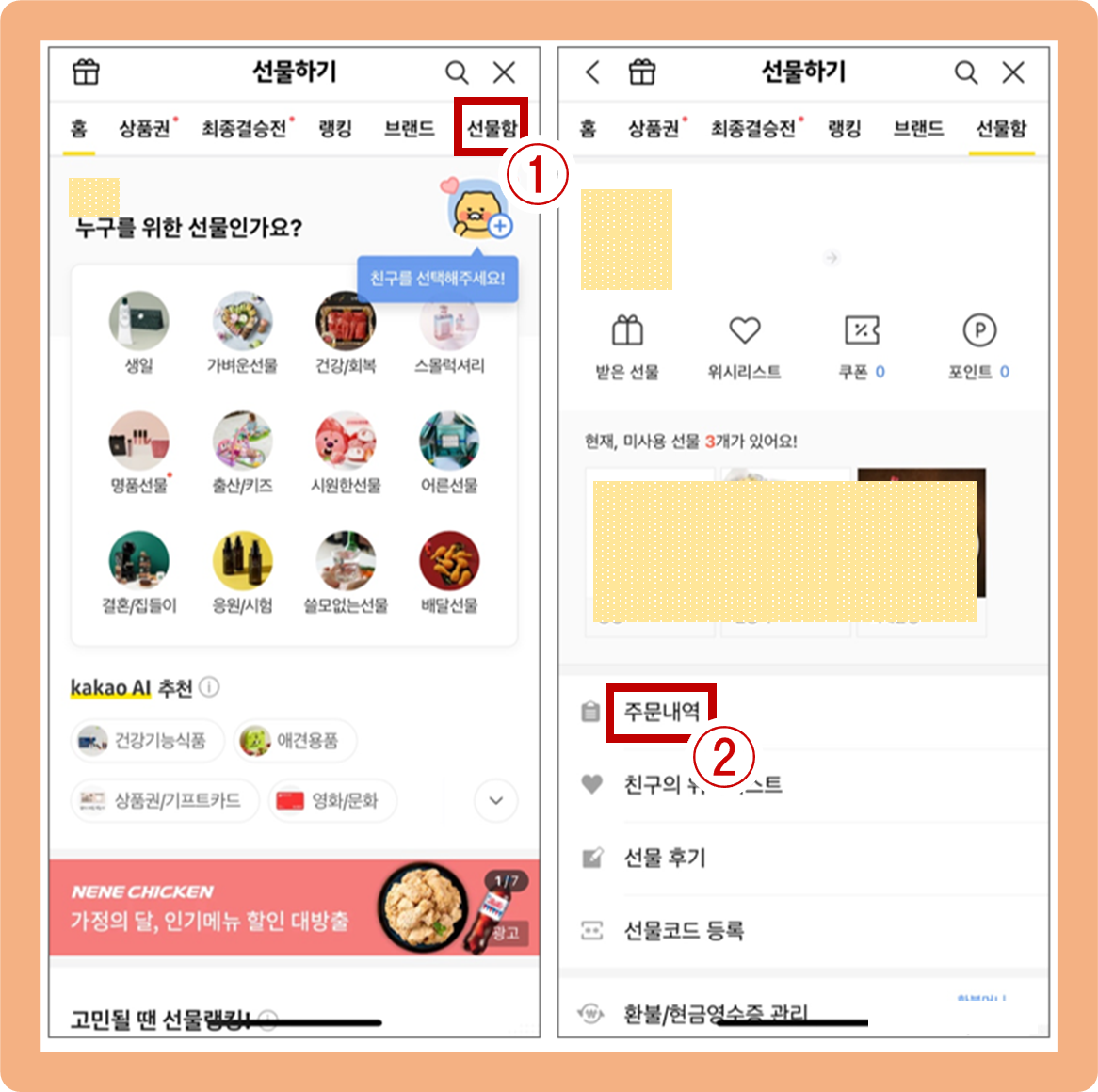카카오톡, 카톡 선물 취소 방법, 선물함 > 주문 내역