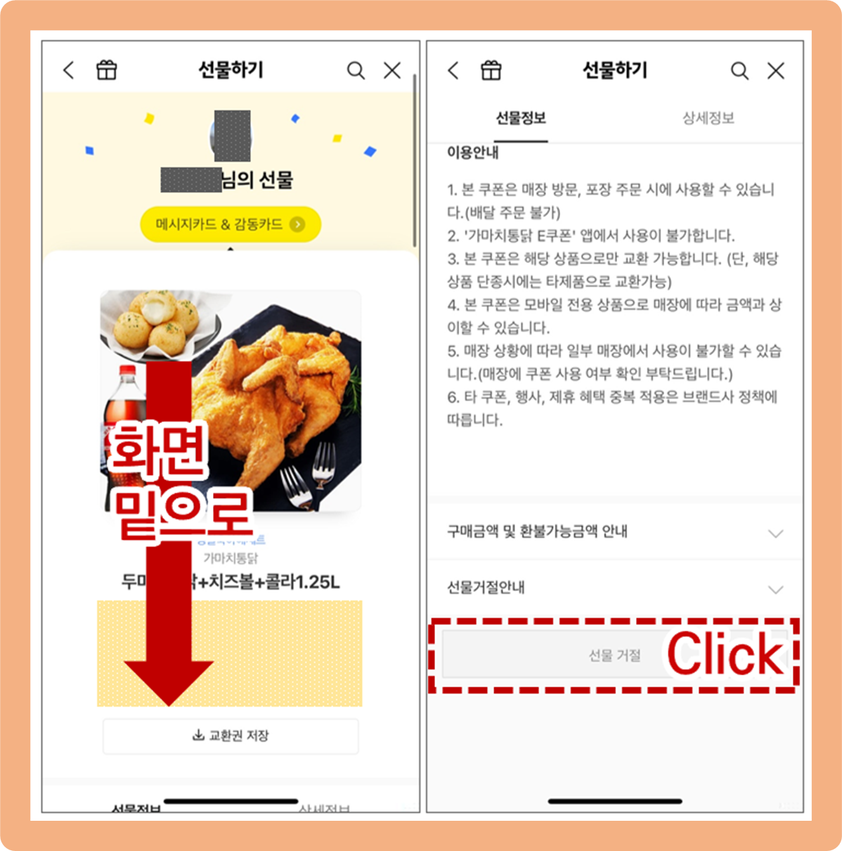 (오른쪽 사진) 맨 아래까지 내려오시면 회색의 '선물 거절' 버튼이 나타나는데, 이 버튼을 눌러주세요.