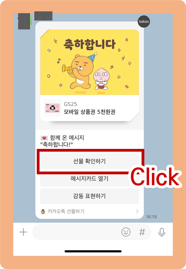 선물을 보냈다는 메세지에서 '선물 확인하기'를 눌러주세요.