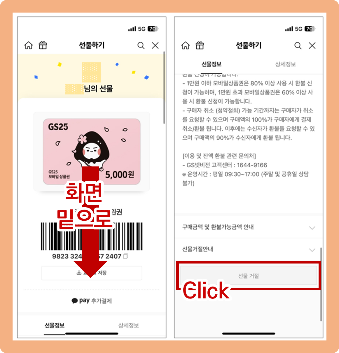 (왼쪽 사진) 그럼 화면에 받은 선물의 내용과 함께 바코드 등이 보이실텐데요. 여기서 화면을 아래로 쭉 내려주세요.