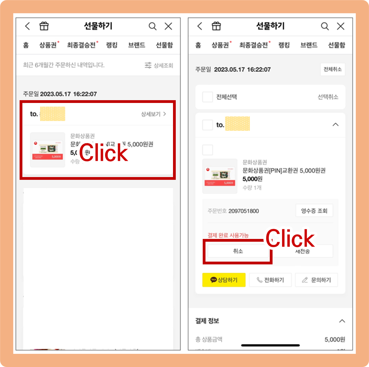 (왼쪽사진) 이 목록 중에서 여러분이 취소하려는 선물을 클릭해주시구요.