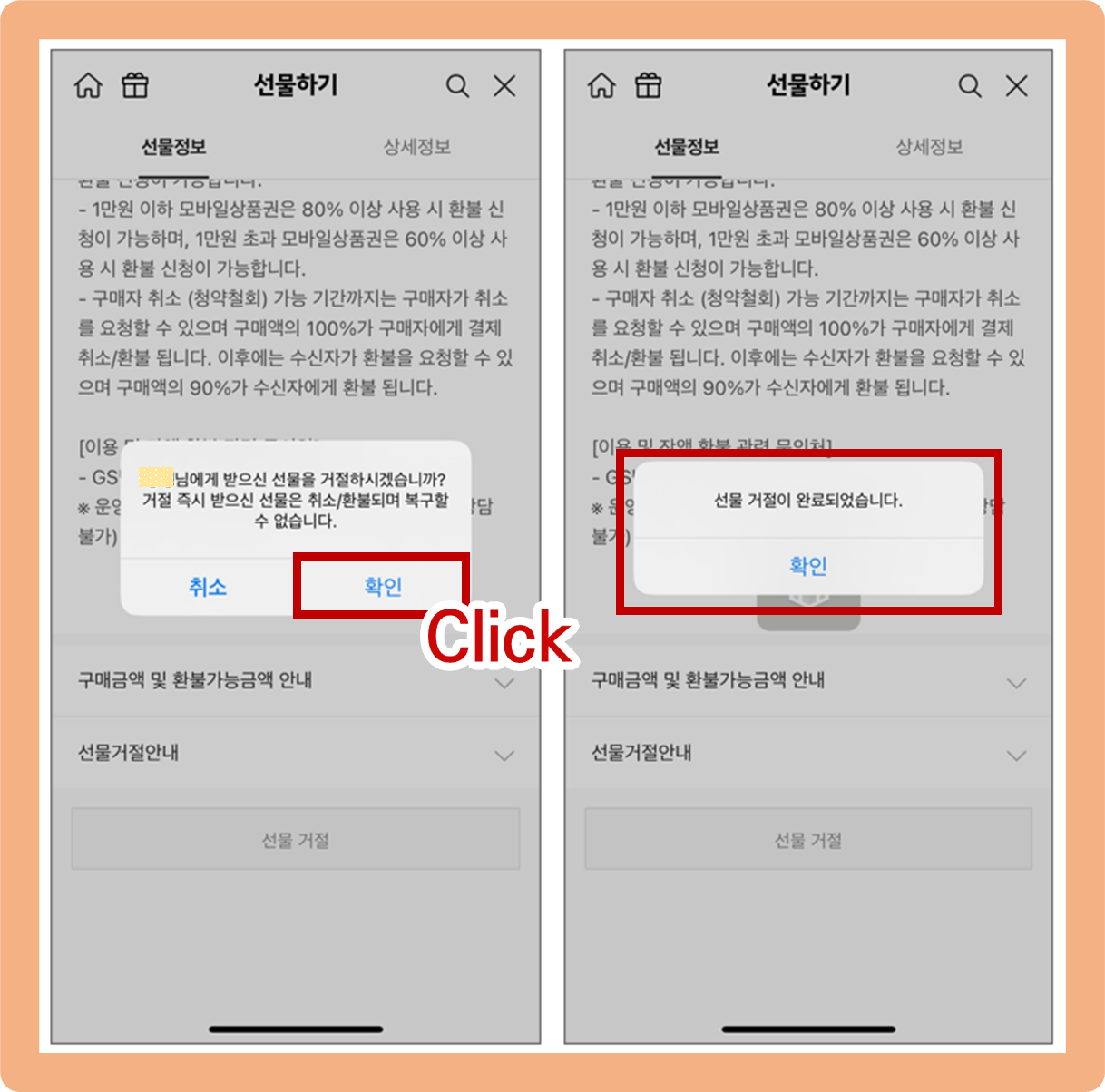 그럼 상대방에게 받은 선물을 거절하겠냐는 질문과 함께 거절 즉시 상품은 취소, 환불되며 복구할 수 없다는 안내 사항이 나오는데요.