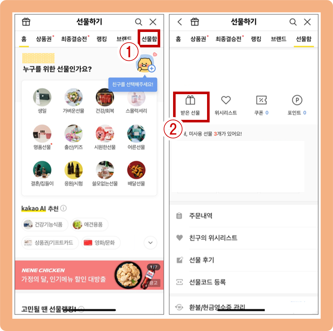 이번에는 주문내역이 아닌 '받은 선물' 버튼을 눌러주세요.