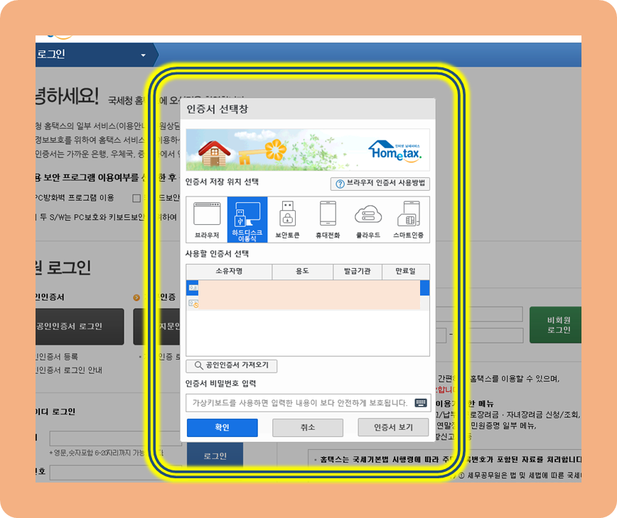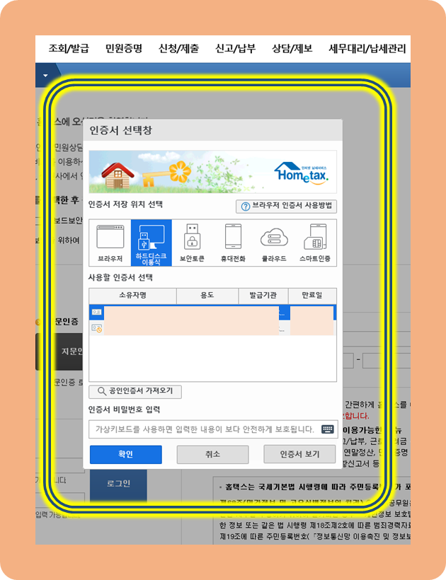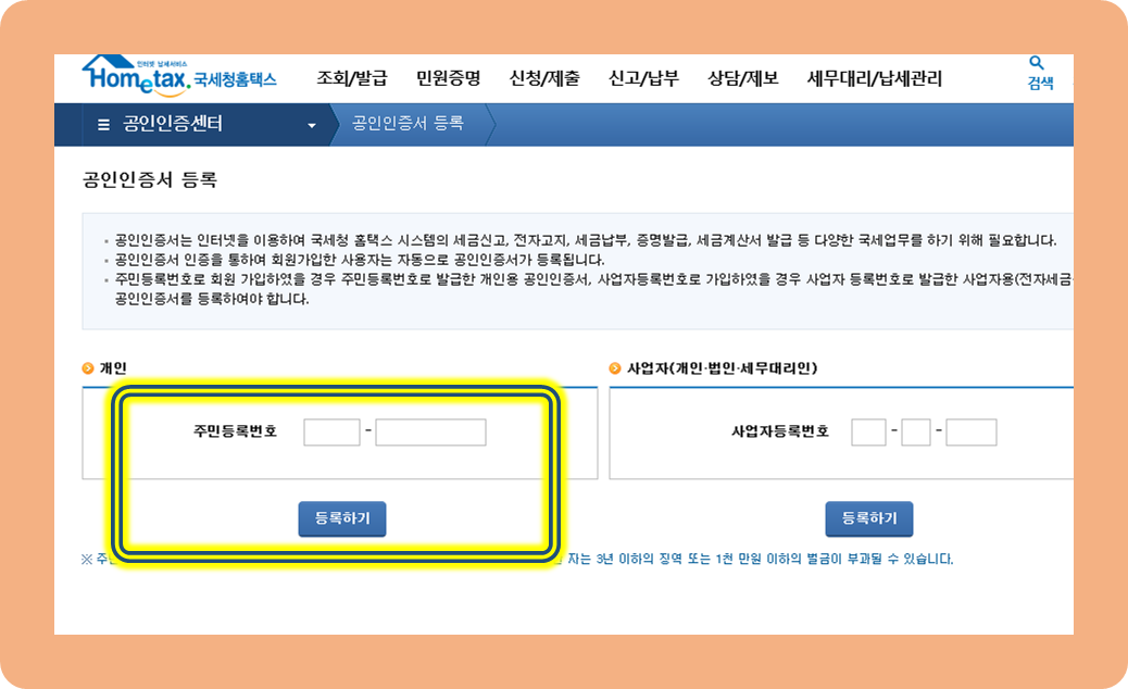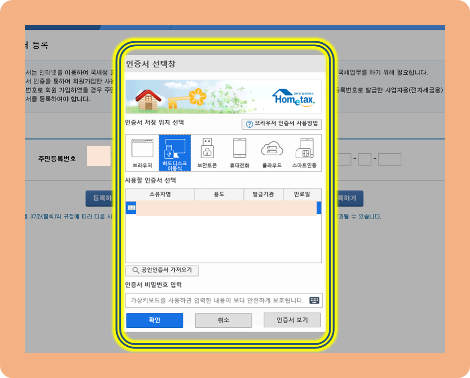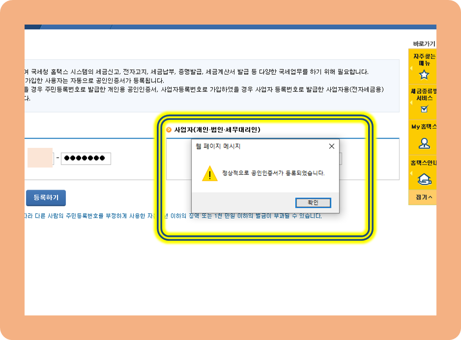 홈택스 웹사이트에서 여러분의 인증서를 등록해야 합니다.