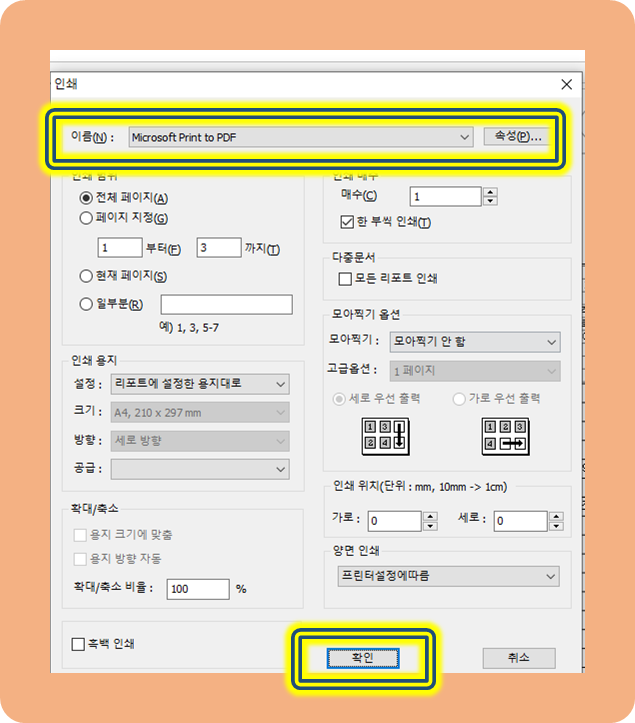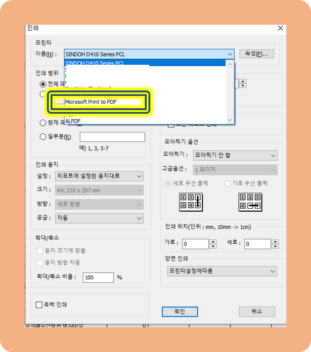 (*저는 microsoft Print to PDF 라고 되어있는데, 다른 종류의 PDF 형식이 써있는 분들 계실거예요.