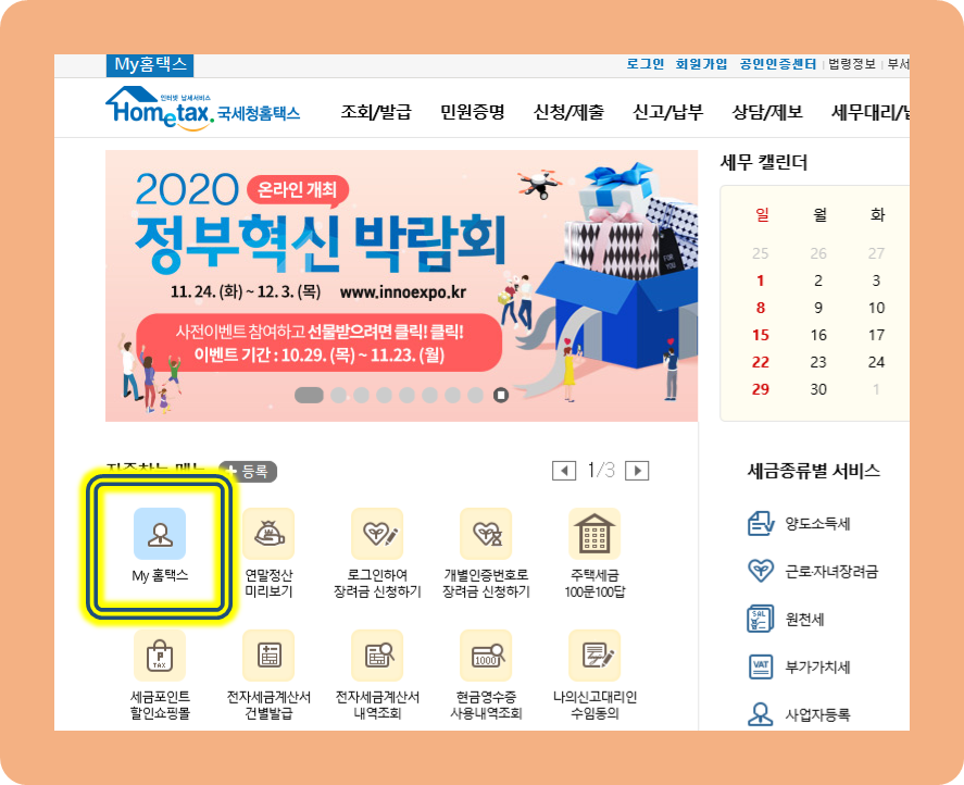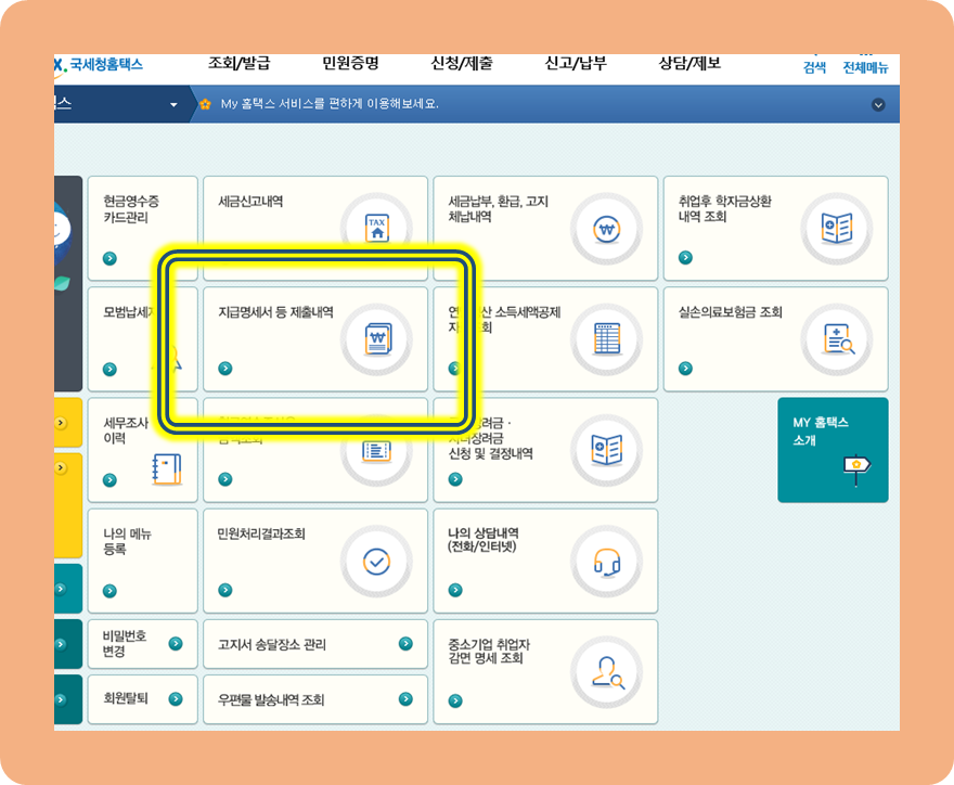자주 가는 메뉴 중 왼쪽에 있는 My 홈택스 메뉴를 클릭해주세요.