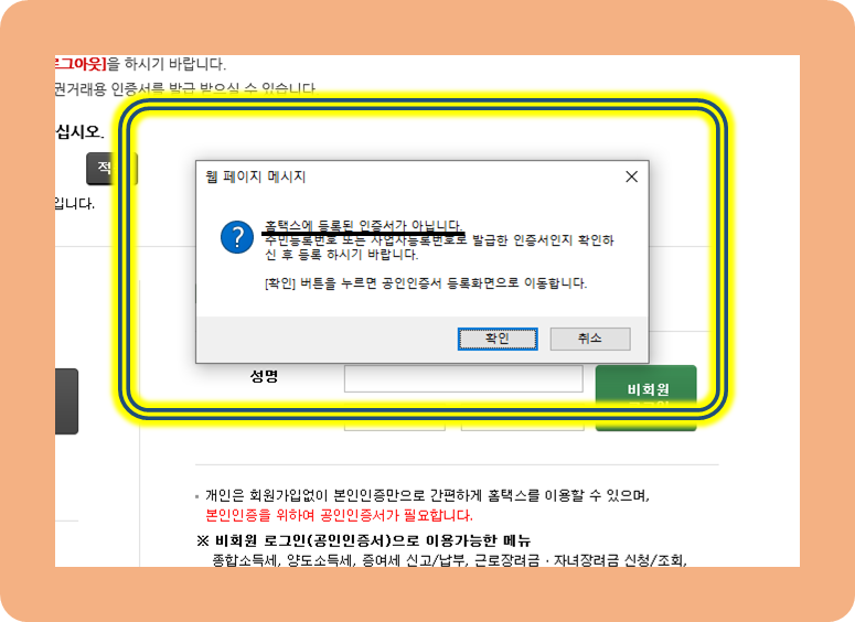 그런데 여기에 증명서가 홈택스에 인증서가 등록되어 있지 않다고 나와있어요