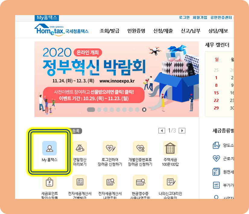 인증서 등록이 완료되면 다시 홈 화면으로 돌아가서 My 홈택스를 클릭해주세요.