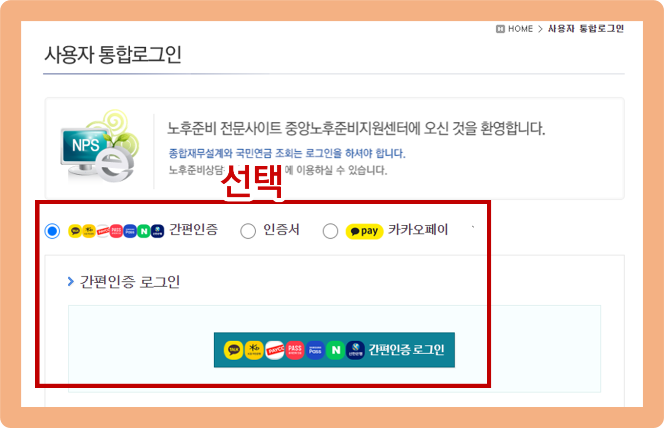 간편인증 / 공동 및 금융 인증서 / 카카오페이 인증 중에서 여러분에게 가장 편한 방법을 선택해서 인증을 진행해주시면 돼요.