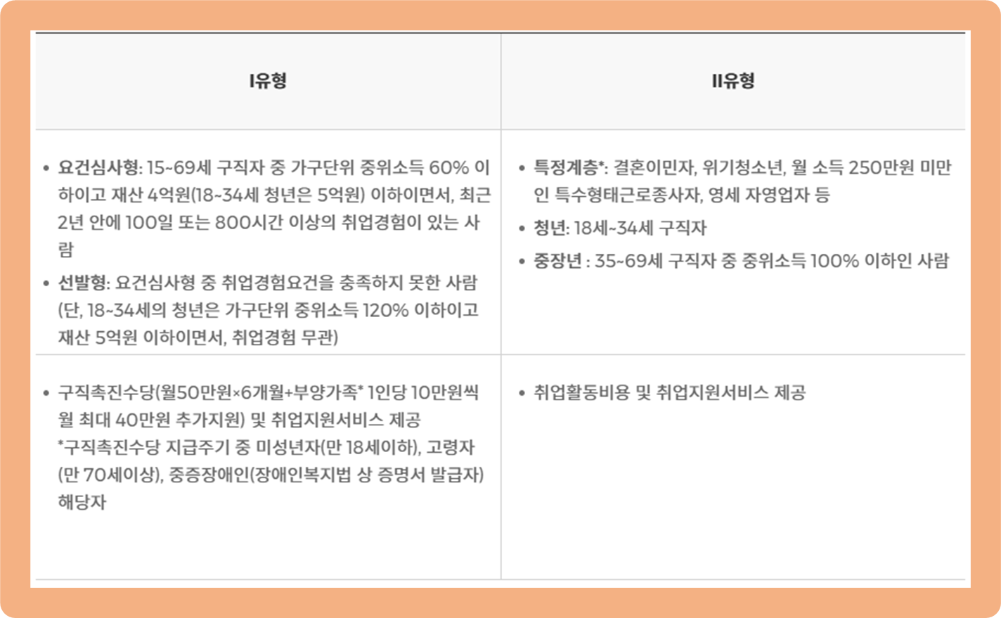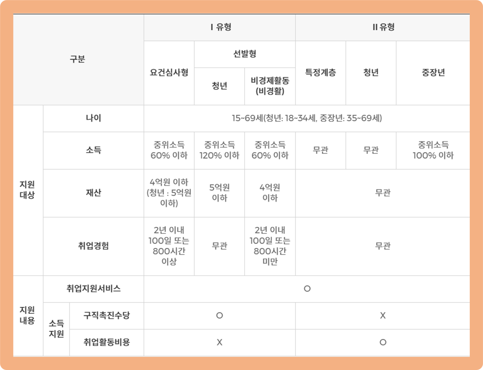 - 지원대상 1. 요건심사형 : 중위소득 60% 이하 및 재산 4억원 이하(18~34세 청년의 경우 5억원)인 만 15세~69세 구직자 + 최근 2년 간 100일 or 800시간 이상의 근로경험 있어야 함.