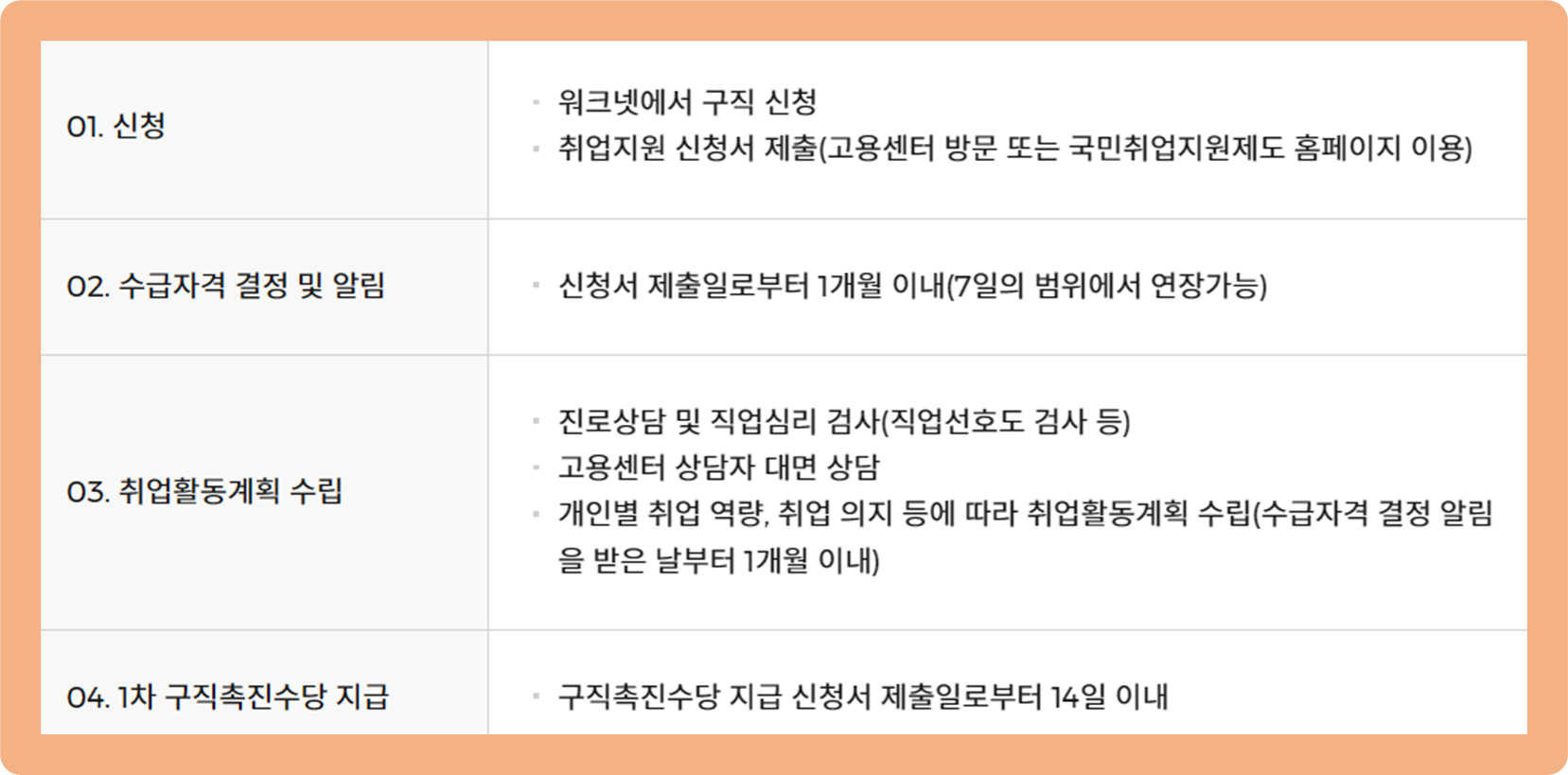 1. 워크넷 구직 신청 / 고용센터 방문 or 국민취업지원제도 공식 사이트 취업지원 신청서 제출