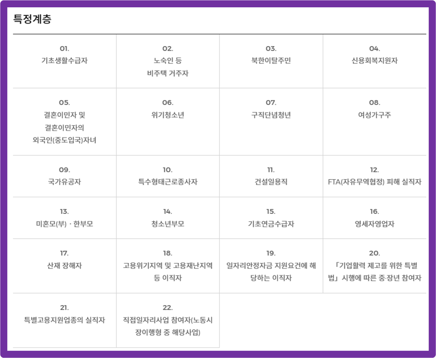 ※22가지 유형의 특정계층 목록은 위 표를 참고해주세요!