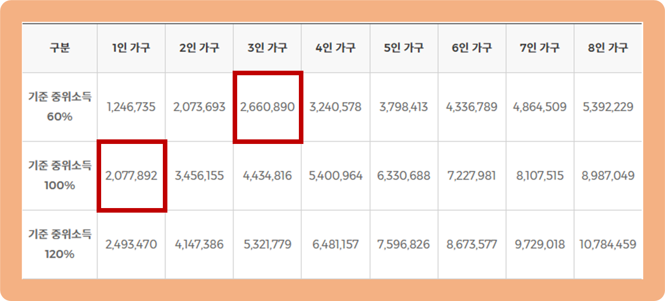 위 표를 통해 여러분이 중위소득 요건에 충족하는 지 확인해주시면 돼요.