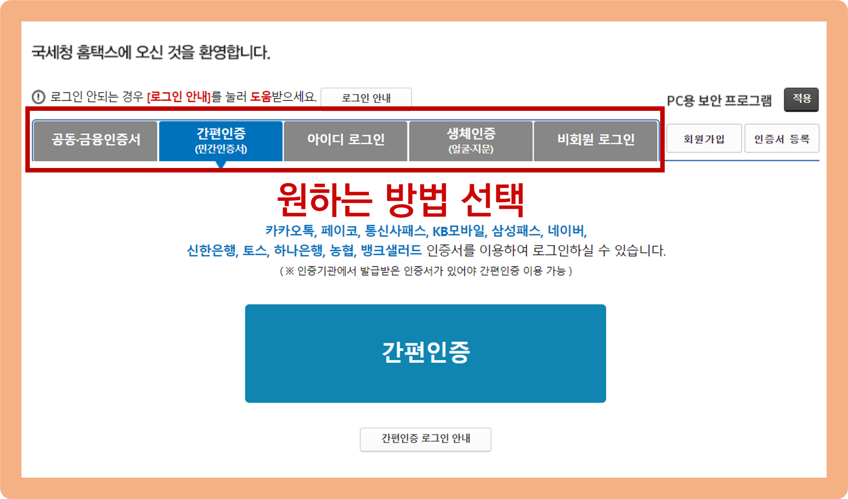 공동 및 금융인증서 / 간편인증 / 아이디 / 생체 인증 등 다양한 방법이 있는데요.