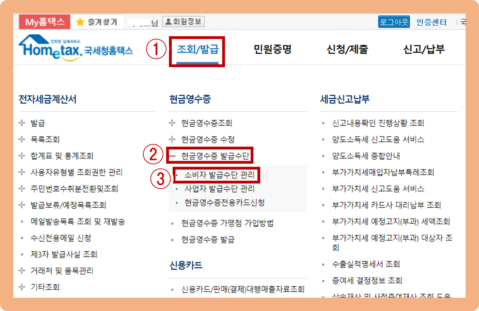 현금영수증 등록방법, 소비자 발급수단 관리 메뉴