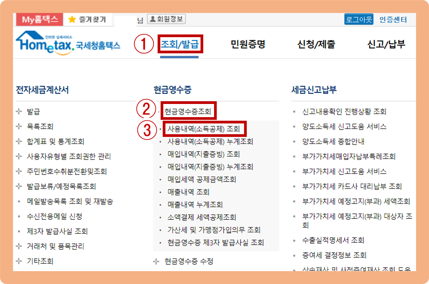 현금영수증 조회방법, 사용내역(소득공제) 조회 메뉴