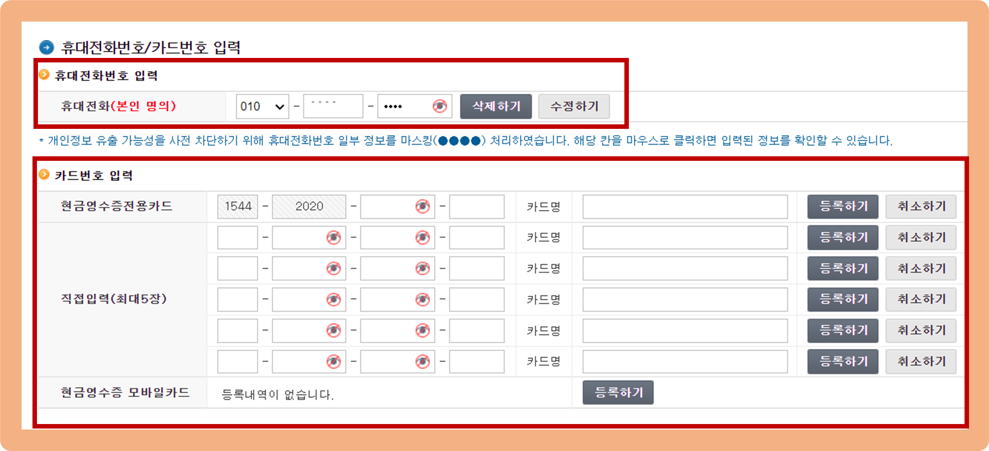 저는 현금영수증 전용카드를 따로 만들어 놓지 않았으며, 굳이 카드가 필요없기 때문에 핸드폰번호만 등록했어요.