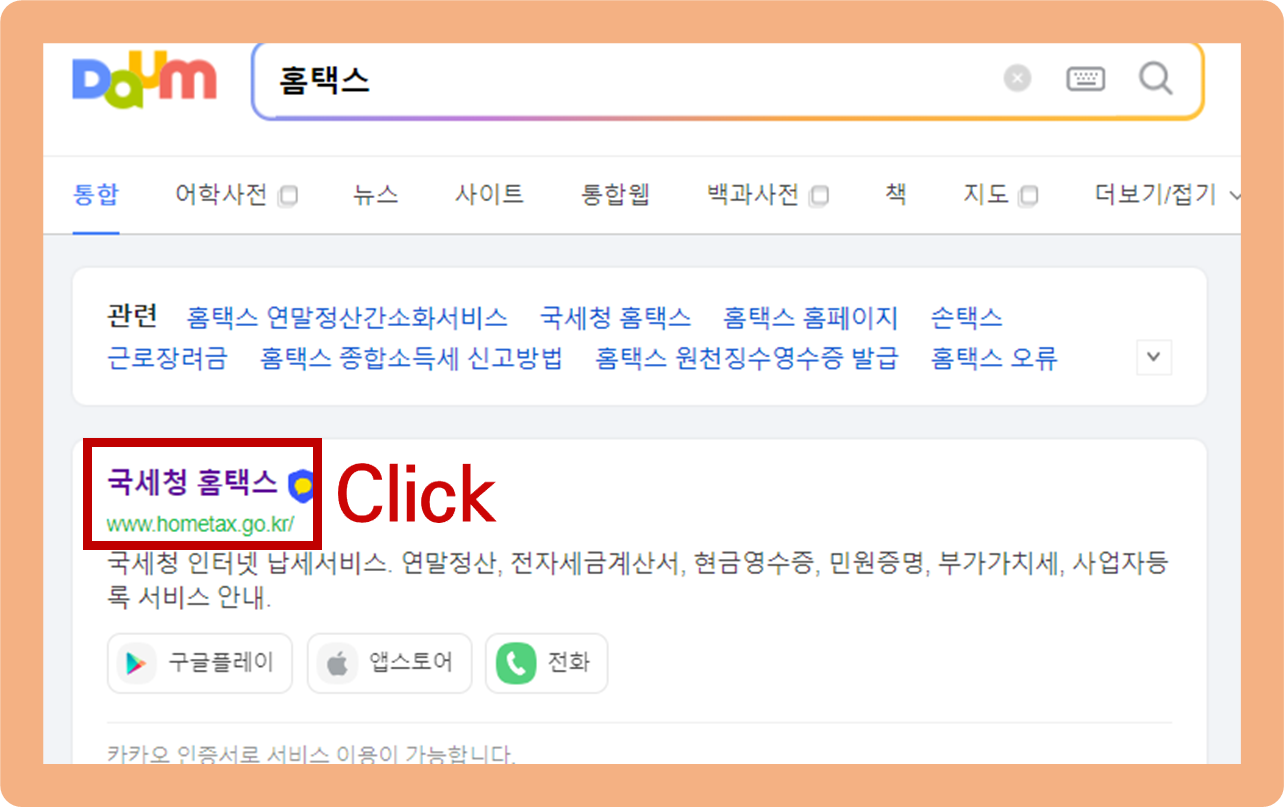 검색창에 홈택스 입력 후 검색하시면, 맨 위에 공식 홈페이지가 나와요. 접속해주세요.