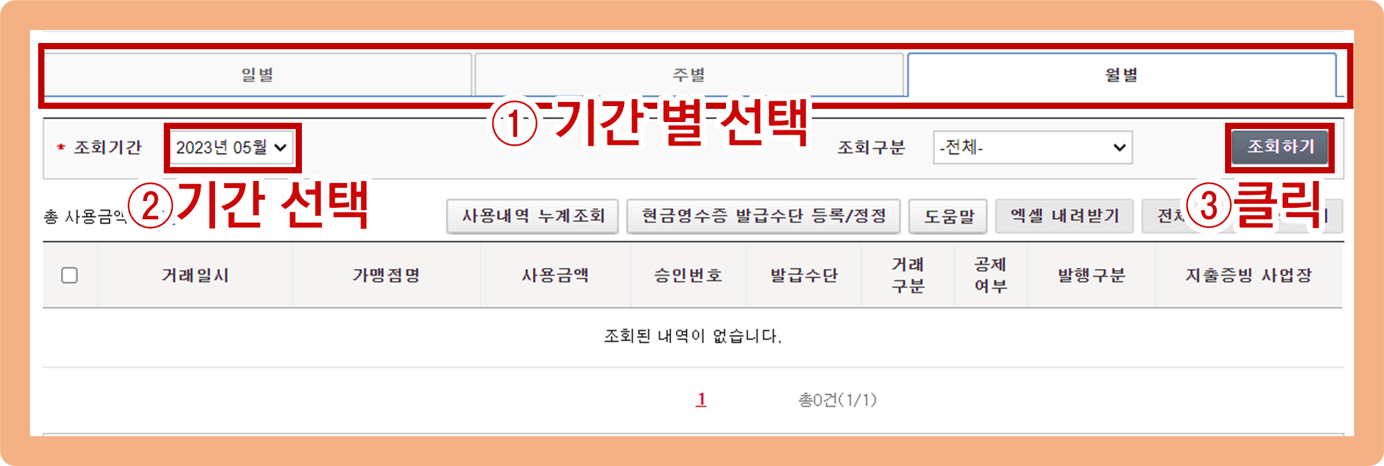 세번째. 그리고 조회 버튼을 누르시면, 해당 기간 동안 여러분이 발급한 현금 영수증 목록을 확인할 수 있어요.