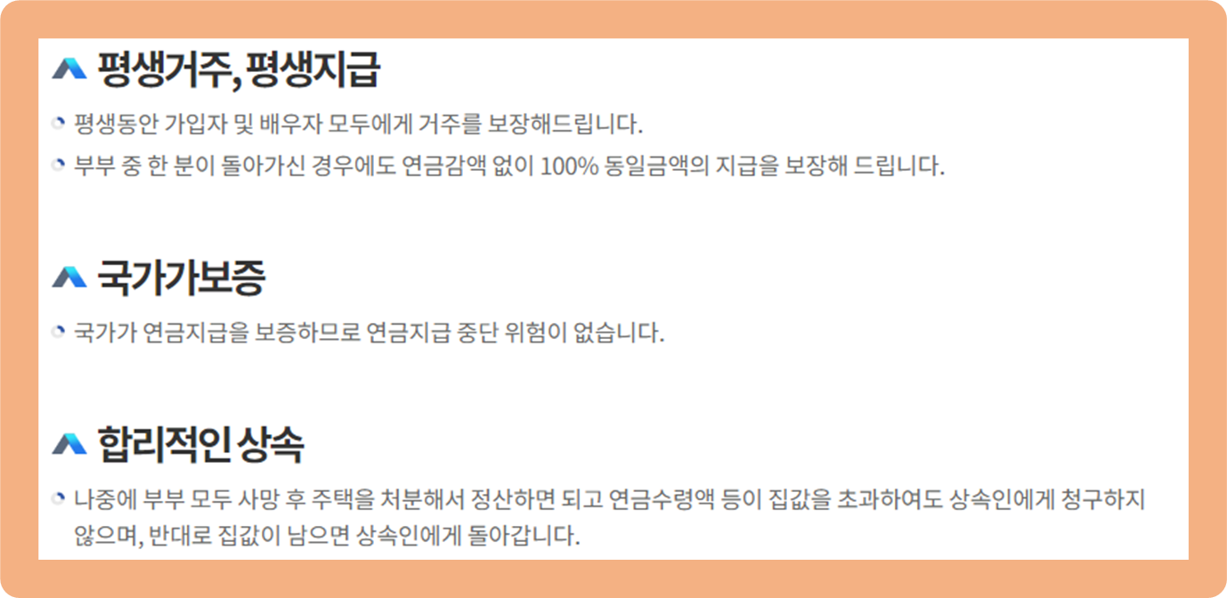 - 평생동안 신청자 및 배우자 부부에게 거주를 보장해줍니다. 혹시나 부부 두 분 중 한 분이 돌아가시더라도 차감없이 동일한 금액을 수령할 수 있어요.
