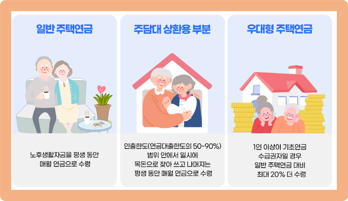 - 일반 주택연금 : 만55세 이상의 신청자가 해당 주택을 담보로 제공하고, 평생 연금 수령