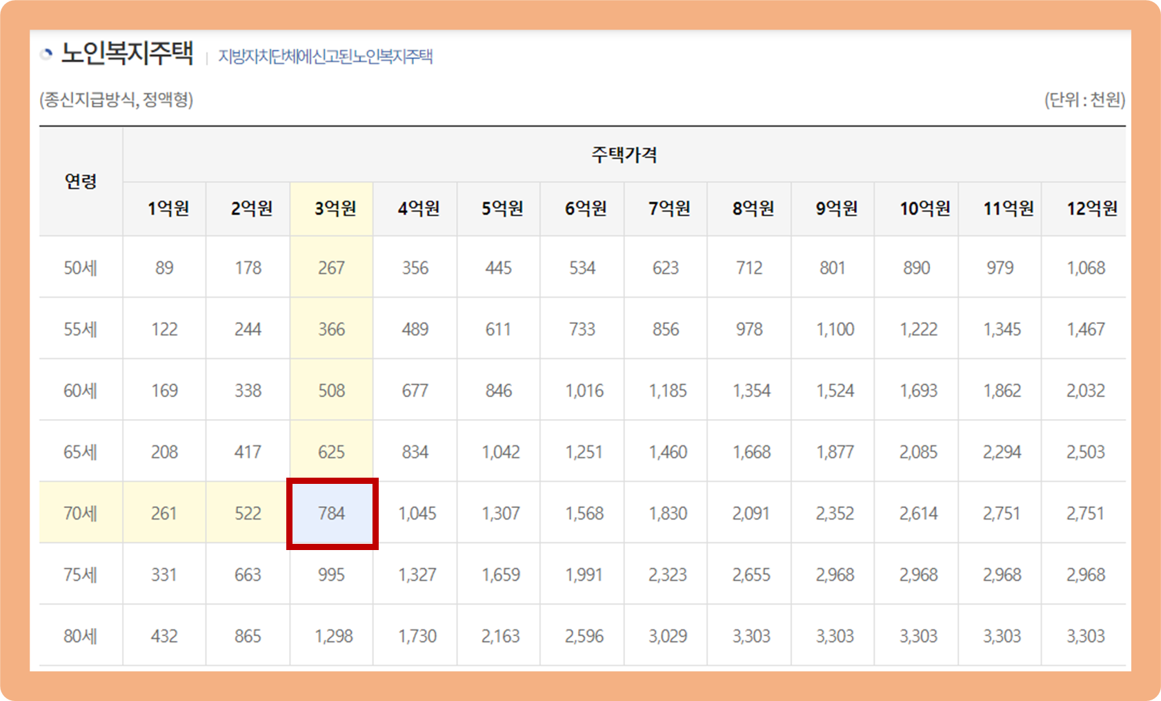주택의 시세가 현재 3억원이고, 신청인 연령이 70세일 때 매월 예상수령액은 784,000원이에요.