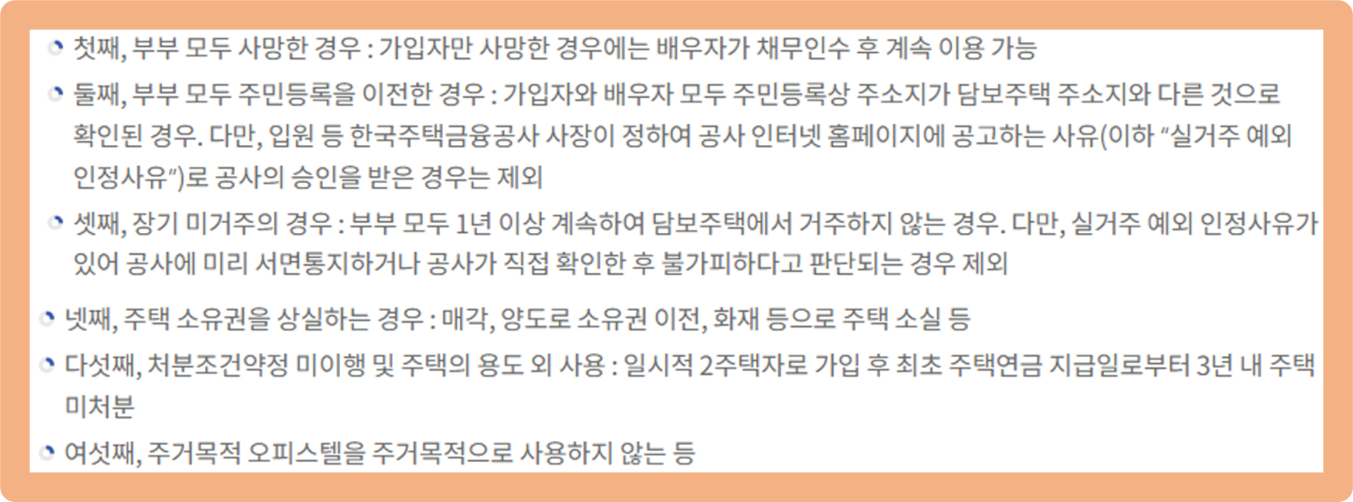 - 만약 수령 중간에 목돈 필요 등 개인 사정으로 인해 해지하게 될 경우에는 그동안 수령했던 연금을 모두 반환하셔야 돼요.(초기에 납입한 보증료도 돌려받지 못해요.)