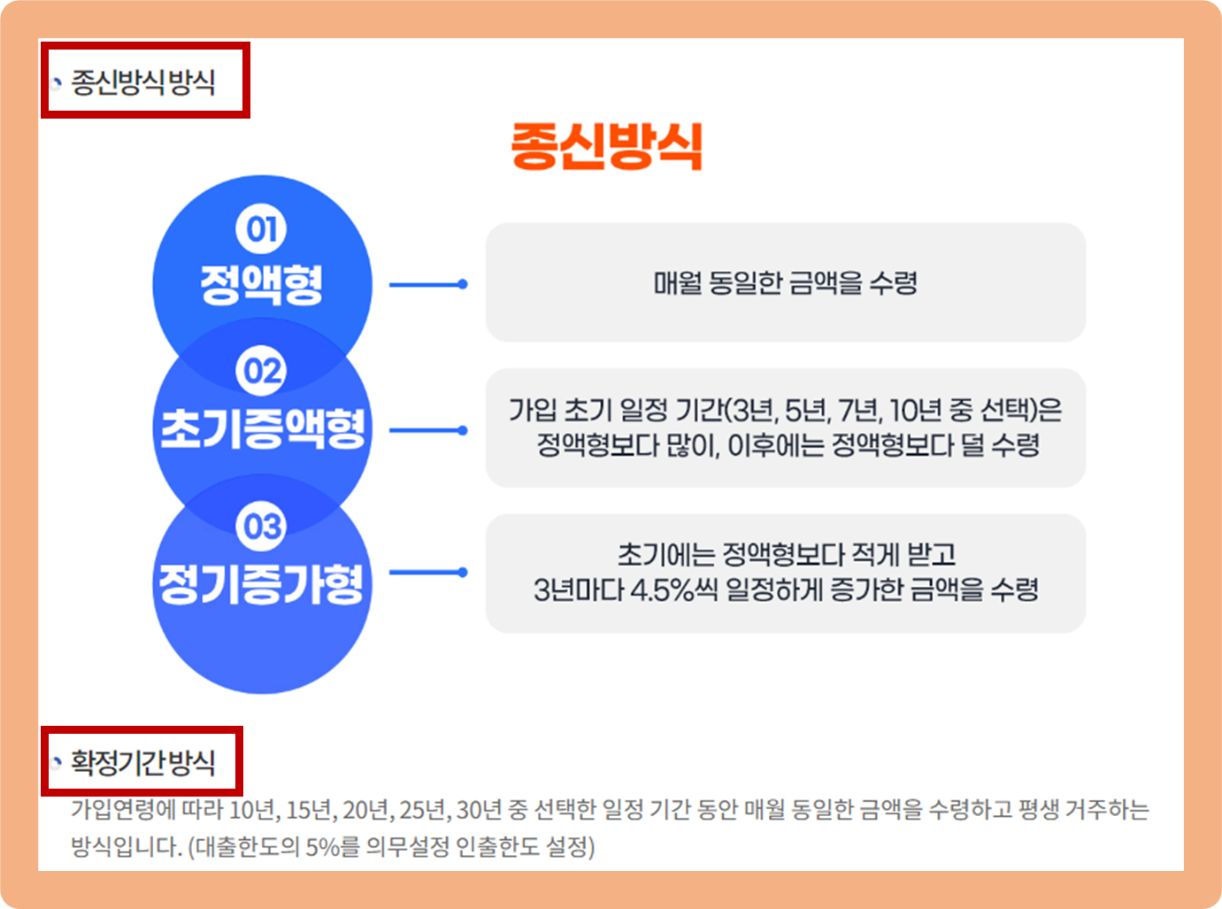 2. 확정 기간 방식 : 신청자 나이에 따라 10년, 15년, 20년, 25년, 30년 중 선택한 기간 동안 매월 일정한 연금을 수령하고 평생 거주