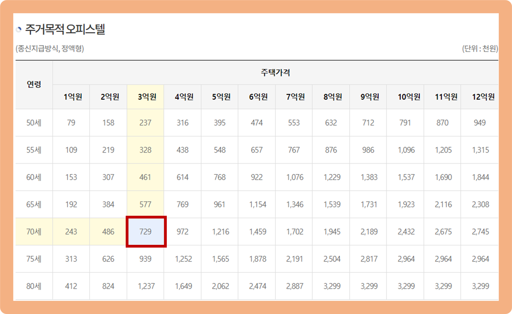주택의 가격이 3억원이고, 신청인의 나이가 현재 70세일 때 매월 729,000원을 수령하게 돼요.
