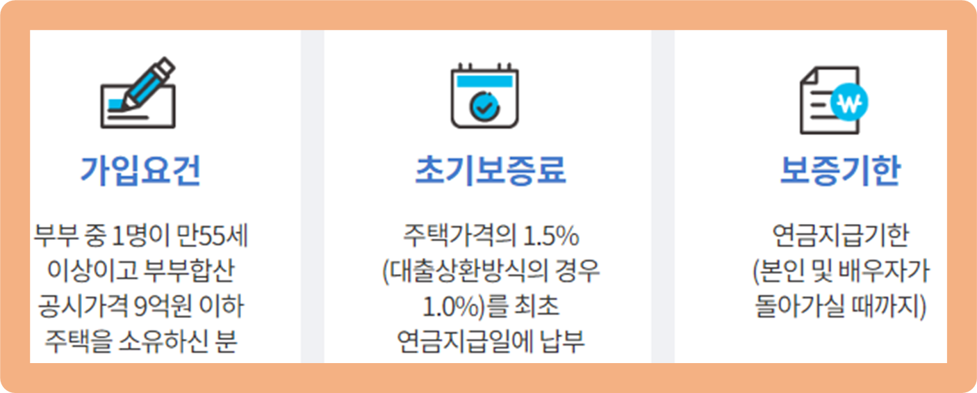그리고 초기보증료는 주택 가격의 1.5%(대출상환방식은 1%)이며, 본인 및 배우자분이 돌아가실 때까지 연금은 평생 지급되죠.