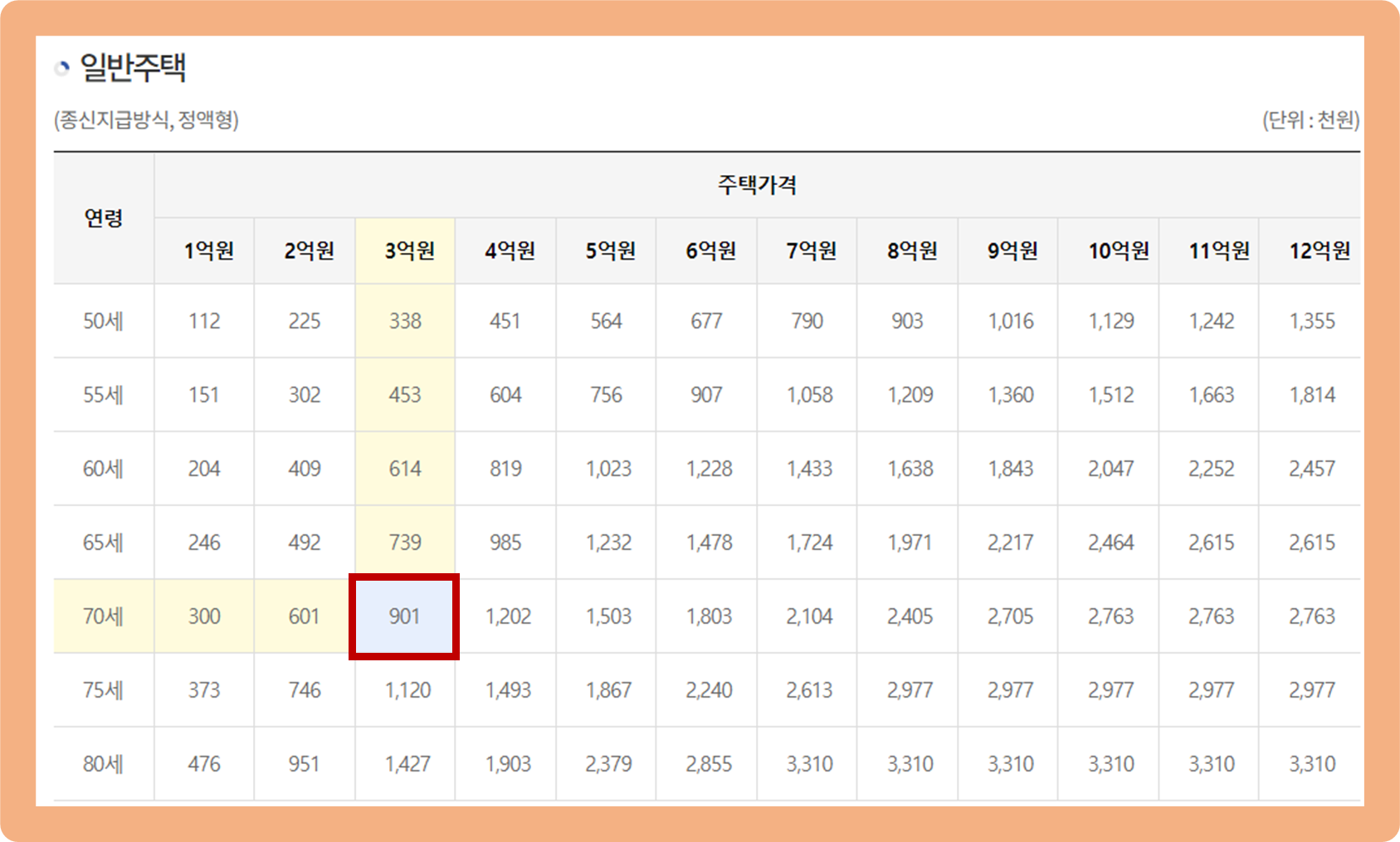만약 주택의 시세가 3억원이고, 신청인의 연령이 70세일 때 매월 901,000원을 수령하게 돼요.