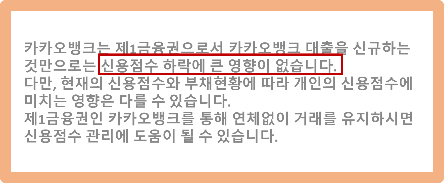 오히려 제1금융권인 카카오뱅크 상품을 이용하면서 연체없이 거래를 유지하면 신용점수가 올라갈 수 있으니, 반드시 연체가 발생하는 일이 없도록 해주세요.