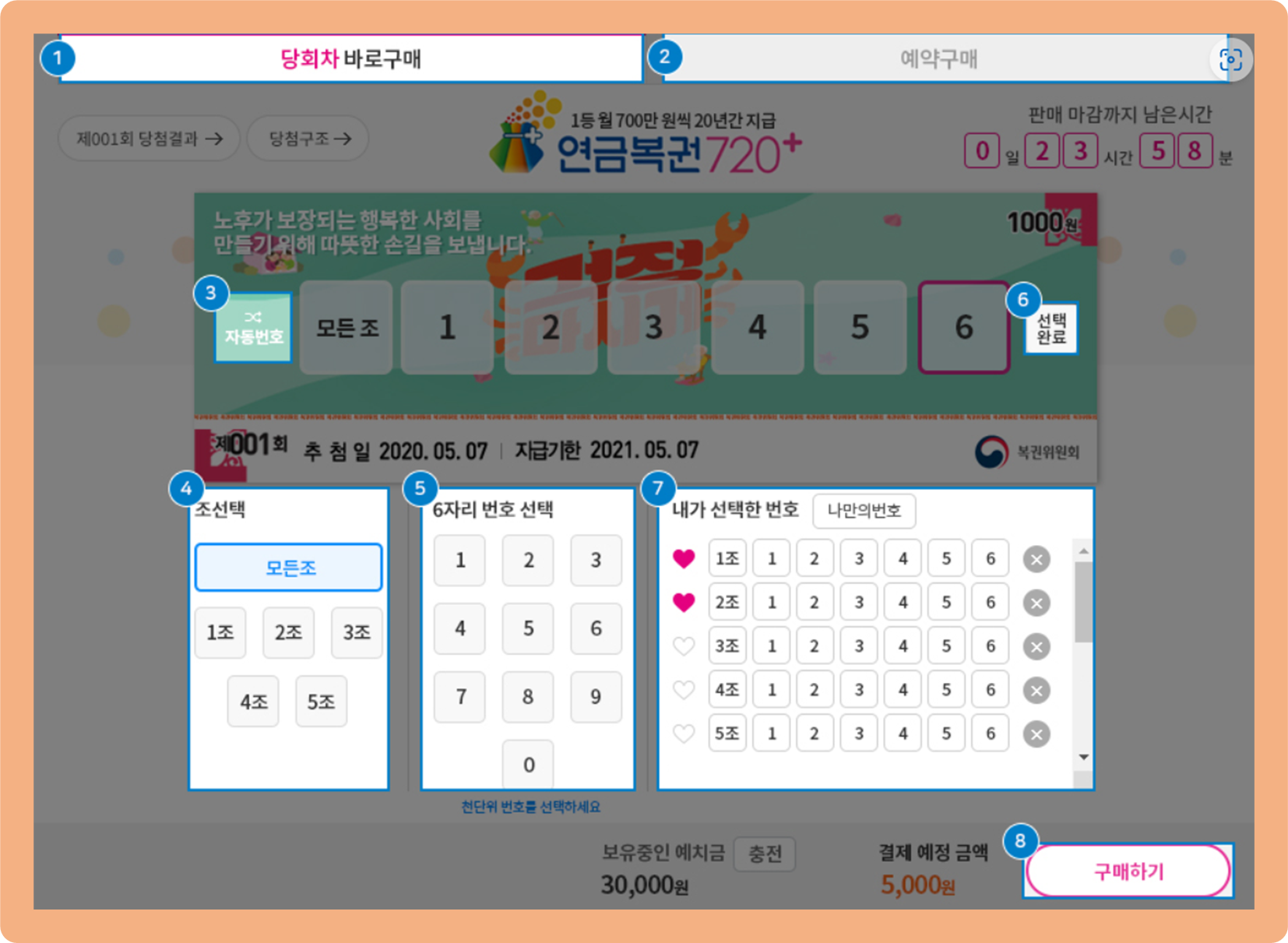 3)조 및 뒤자리 6개 번호를 임의로 선택.