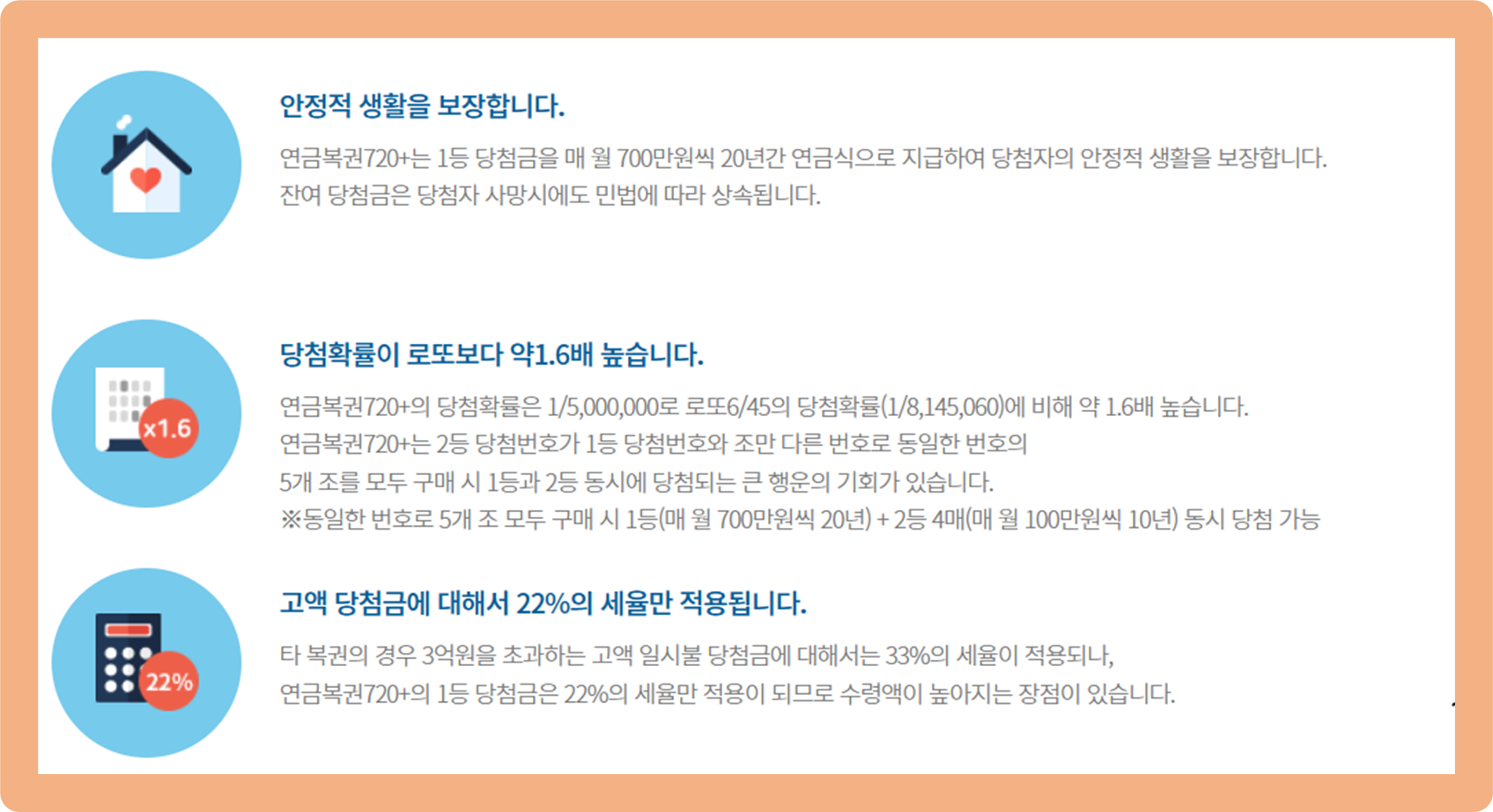 또 타 복권의 경우 당첨금이 3억원을 초과하면 33%의 세금이 부과되나, 연금복권은 1등에 당첨되어도 22%의 세금만 부과되므로 실제 받는 수령액이 높다는 특징이 있죠.