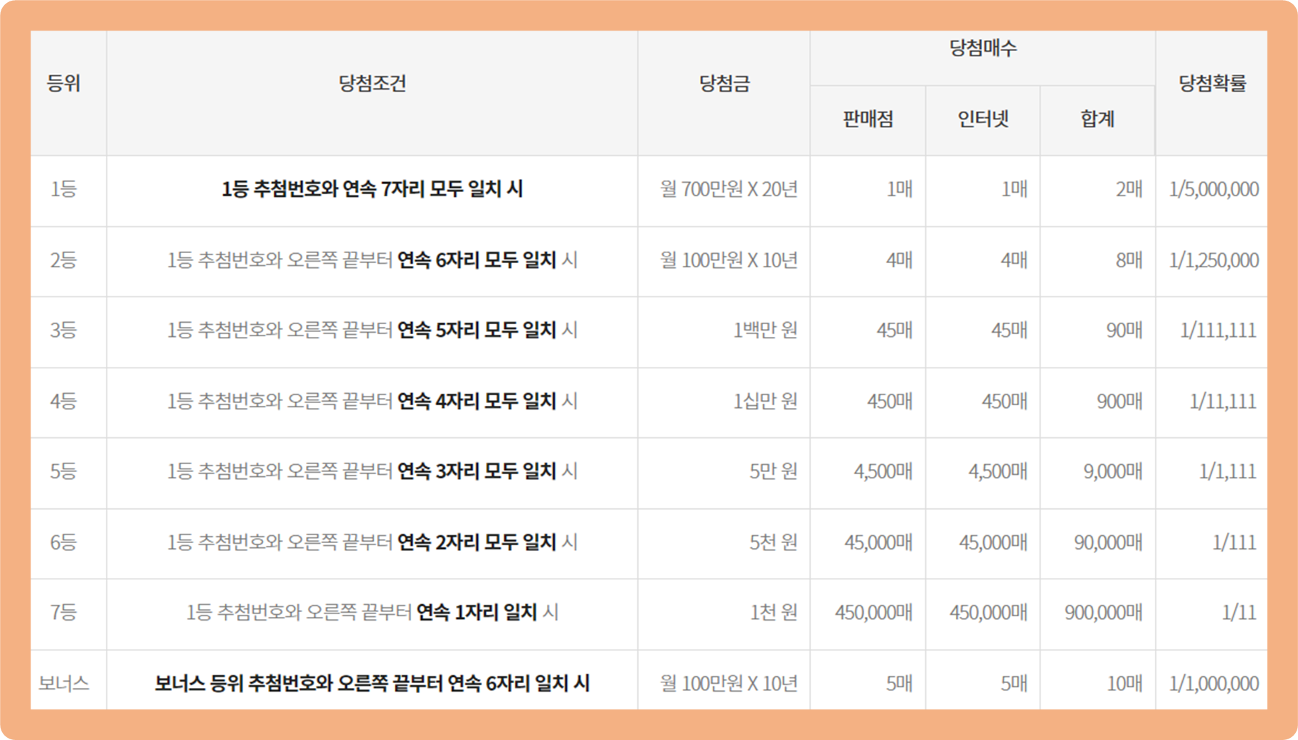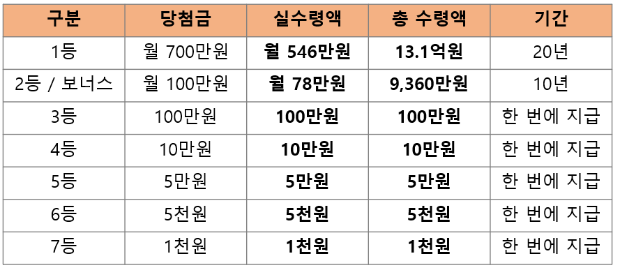 우선 1등에 당첨되면 매월 700만원을 20년 간 수령하며, 2등 및 보너스는 매월 100만원을 10년 간 수령한다고 알려져있는데요.