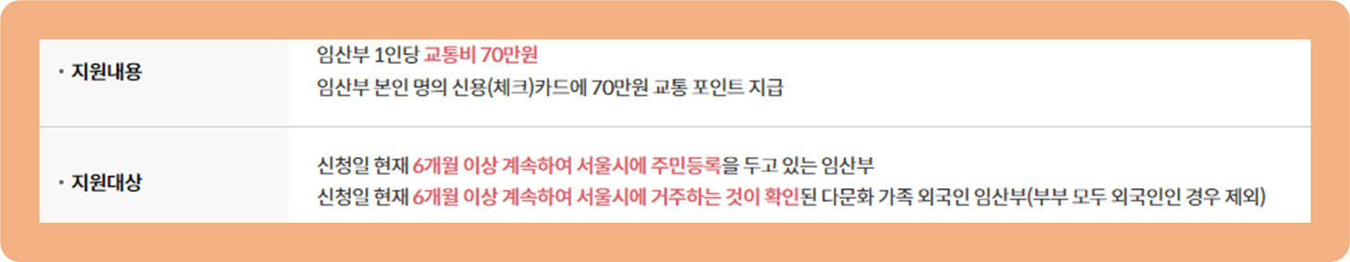 - 신청방법 : 관할 주민센터 방문 신청 or '서울시 임산부 교통비 지원' 공식 홈페이지 신청 or '정부24' 홈페이지 신청.