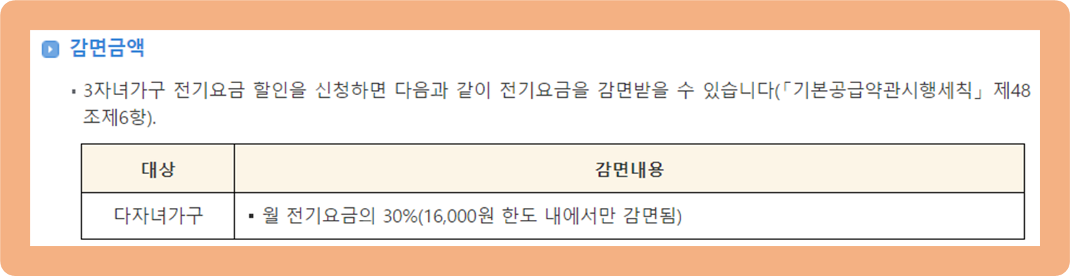 다음으로는 전기세 감면 혜택인데, 이 혜택은 가구원 중 자녀가 3명 이상인 다자녀 가구만 신청할 수 있어요.
