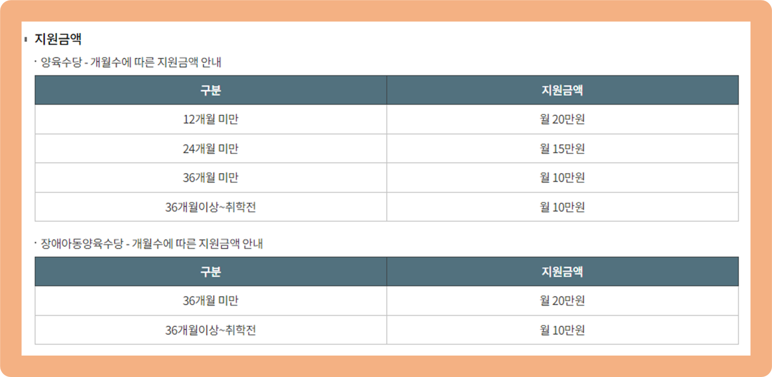 - 36개월 미만 및 36개월 이상~취학 전 : 매월 10만원