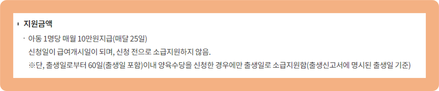 이 혜택도 신청일부터 지원금이 지급이 시작되는 것이기 때문에, 아이가 태어나면 하루라도 빨리 신청하시는 걸 추천드려요.
