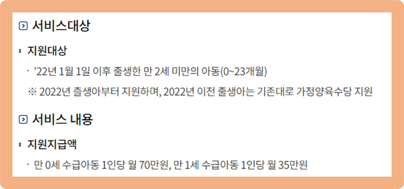 이 제도는 2022년 이후 출생아 기준 만 2세인 아이부터 지원받을 수 있어요.