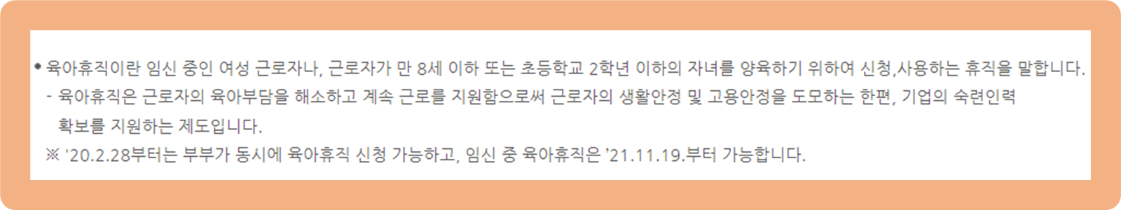 법적으로 보장해주는 권리이니, 육아휴직이 필요하신 분들은 반드시 신청해주시길 바랄게요.