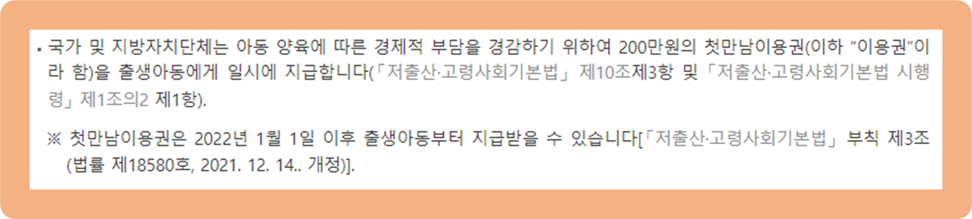 우선 2022년 1월 1일 이후 출생한 아이부터 받을 수 있는 첫만남 이용권 지원 제도예요.