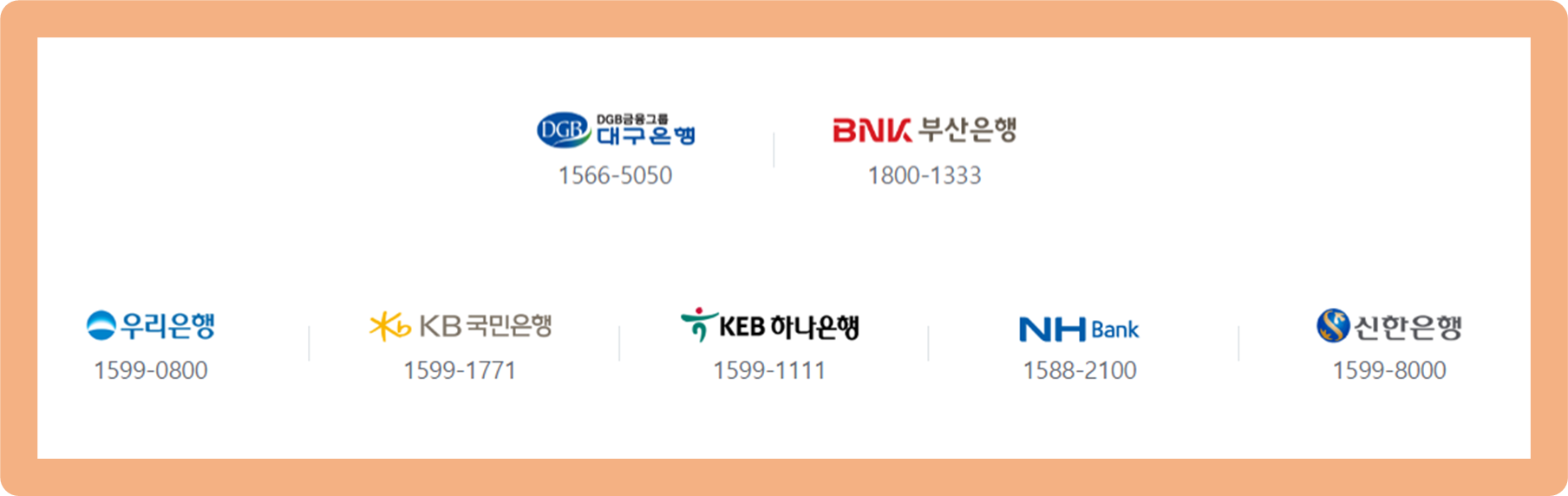 DGB대구, BNK부산, 우리, KB국민, KEB하나, NH농협, 신한 은행에서 신청 가능하므로 가까운 영업점에 방문 및 전화해보시는 걸 추천드려요.