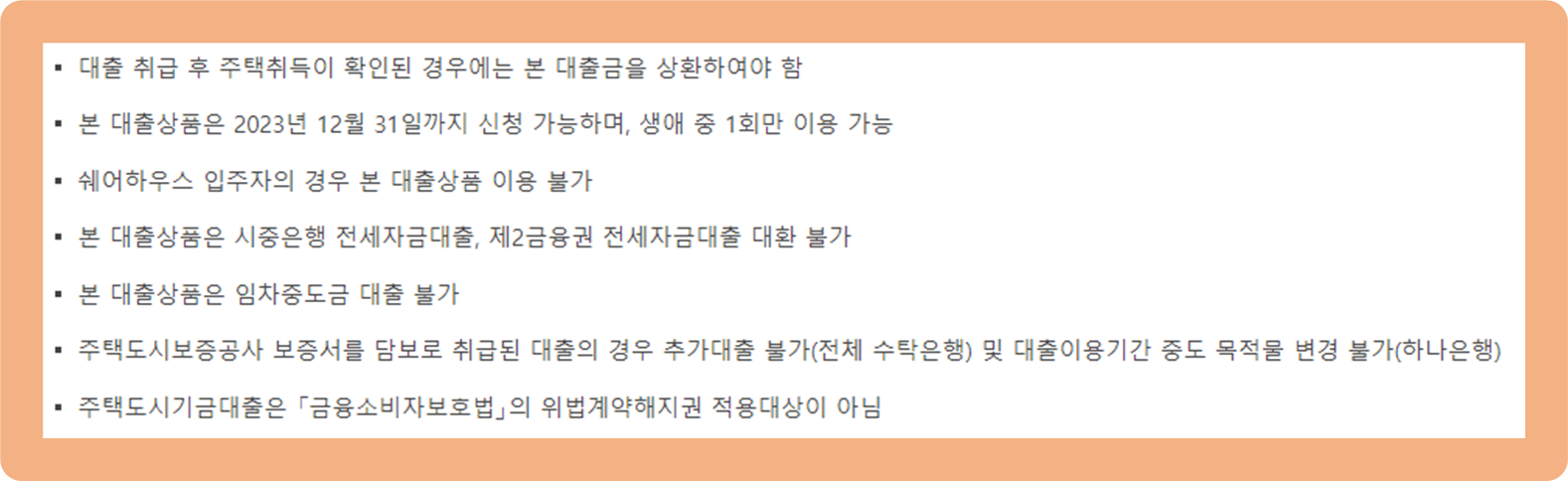 그리고 본 상품은 시중은행의 타 대출 대환을 진행할 수 없으며, 임차중도금 대출도 불가능해요.