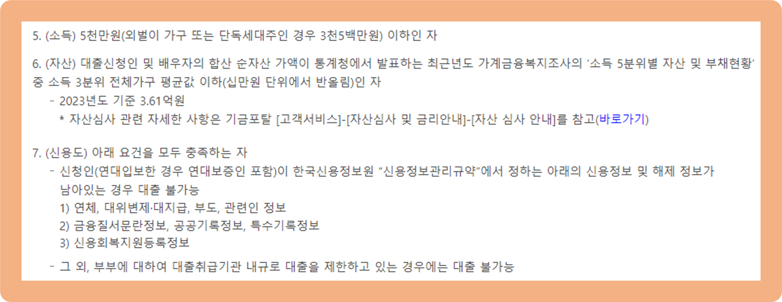 6. 대출신청인과 배우자의 순 자산 합산액이 가계금융복지조사 기준 소득 '3분위' 평균값 이하여야 합니다.