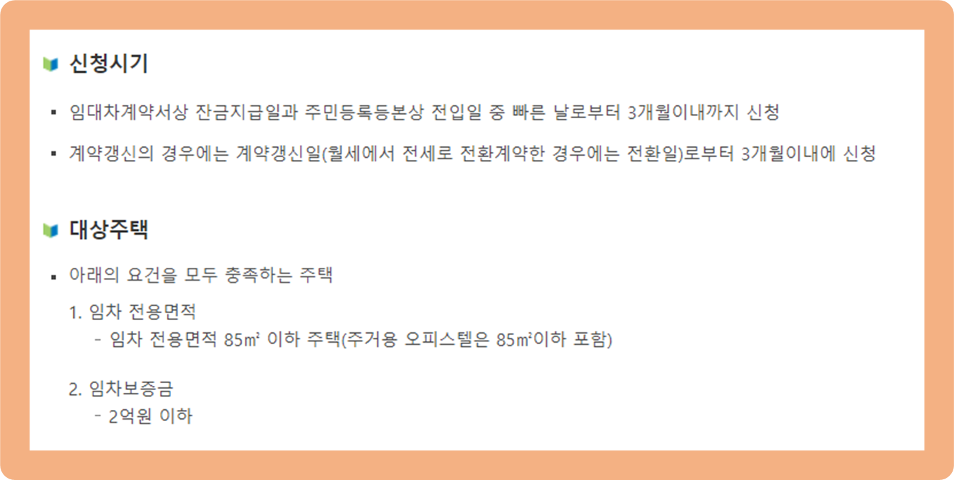 - 신청 시기 : 체결한 계약서 상 잔금납부일과 주민등록등본상 전입일 중 더 빠른 날부터 3개월 이내에 신청해야 돼요.