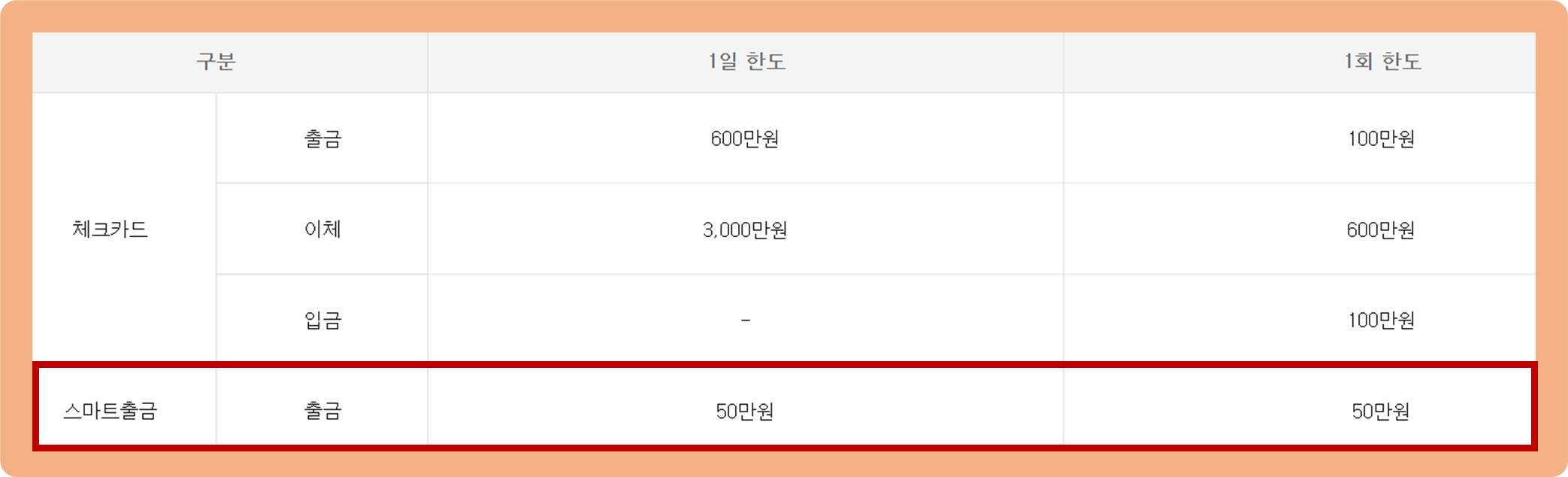 만약 체크카드 없이 스마트폰을 통해서만 현금을 출금하시려는 경우에는 1일 및 1회 한도가 50만원으로 제한되어 있어요.